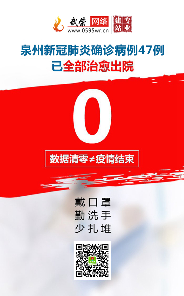 從泉州市衛(wèi)健委獲悉,隨著今日下午,泉州市定點醫(yī)院最后一例新冠肺炎確診病例治愈出院,泉州新冠肺炎確診病例清零啦! 自1月23日泉州市報告首例確診病例以來,累計報告47例(包括1例危重型、3例重型)確診新冠肺炎病例已全部治愈,實現確診患者零死亡、醫(yī)務人員零感染。
